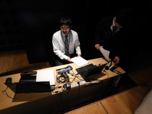 舞台そでで画面の操作をしています。頑張って!!